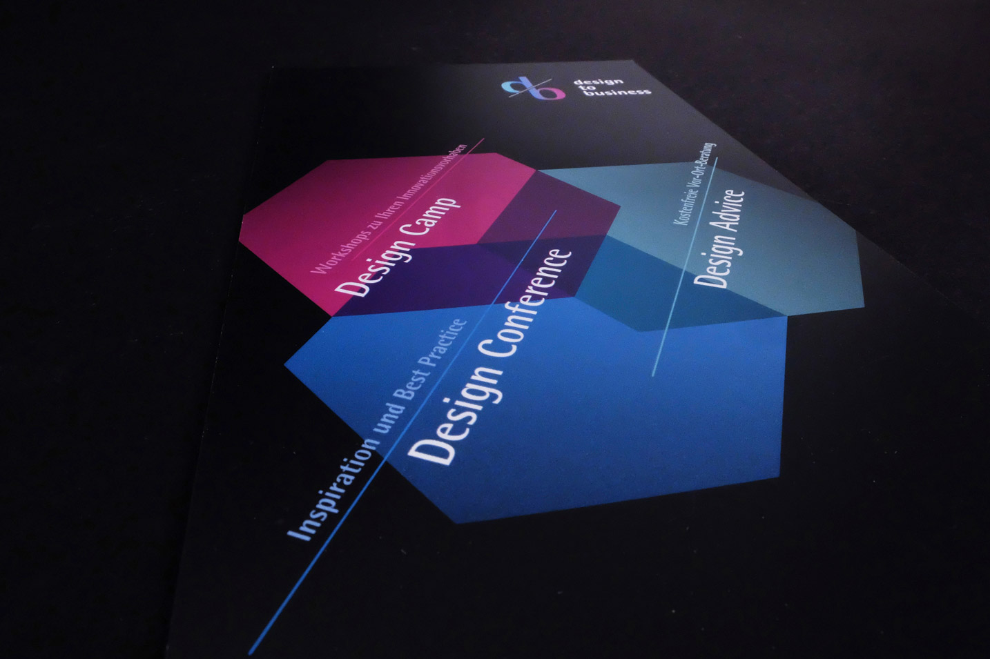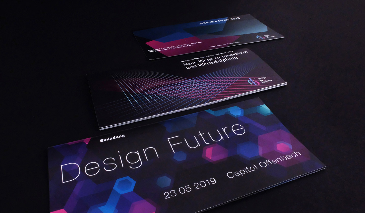 Das von der IHK Offenbach initiierte Design-Netzwerk design to business unterstützt hessenweit mittelständische Unternehmen bei ihrer Geschäftsentwicklung. Unser Büro überarbeitete das Erscheinungsbild und betreute die Entwicklung der visuellen Kommunikation. In diesem Rahmen entstanden Logos und Keyvisuals für diverse Veranstaltungen und Konferenzen sowie unterstützende Medien.